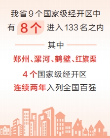 国家级经开区,是产业发展的主引擎和对外开放的主平台。在此次对全国230家国家级经开区的考评中,我省9个国家级经开区中有8个进入133名之内,其中郑州、漯河、鹤壁、红旗渠4个国家级经开区连续两年入列全国百强。